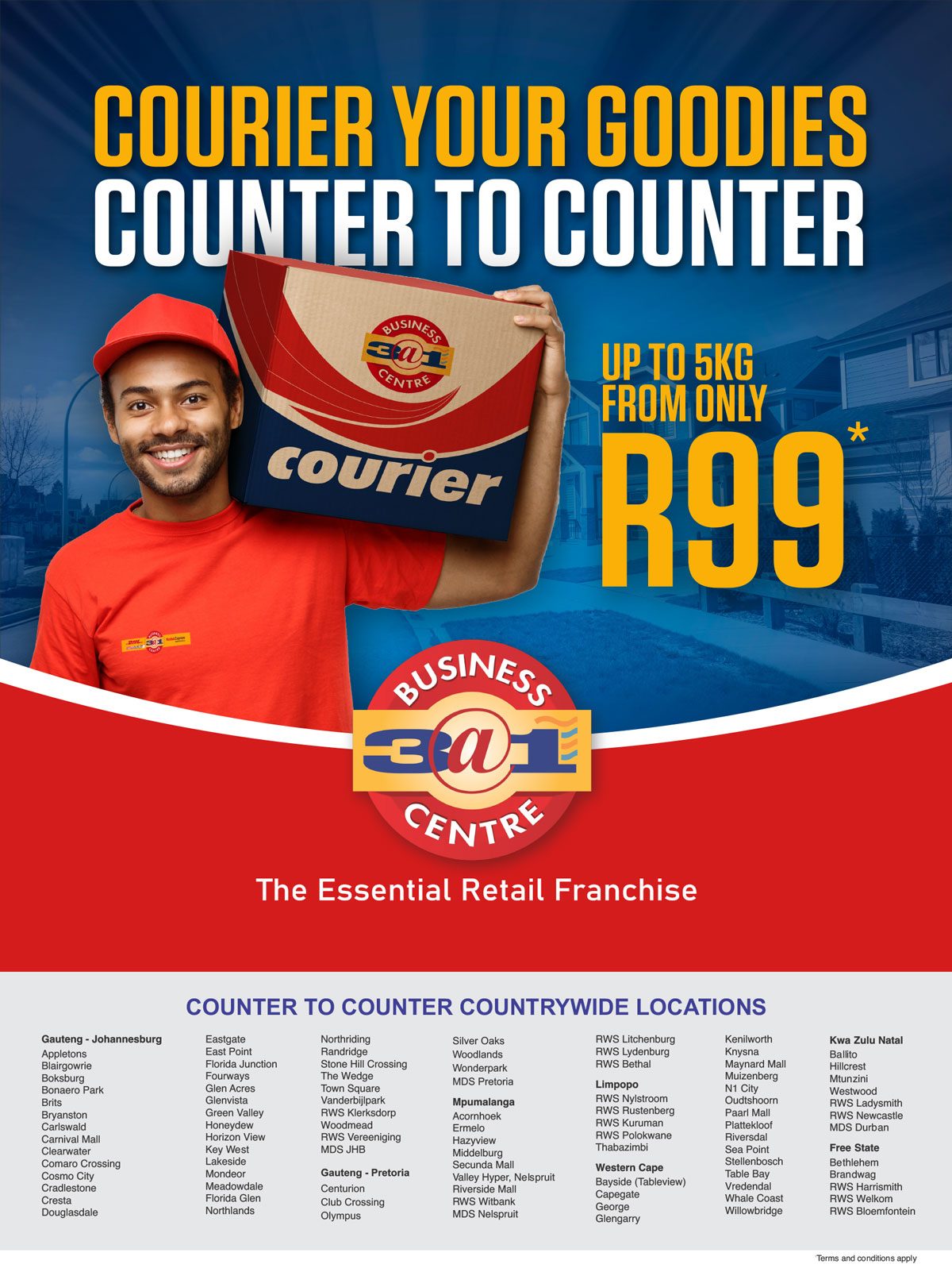 Send documents and packages from as little as R99.00 Counter-to-Counter within South Africa. Prices depend on the size (length & width & height) and the weight of your parcel, its final destination and the time sensitivity of delivery. T&C’s apply and incorrect information provided for the shipment may result in delays and added costs to be charged. Ask us for a free quote.